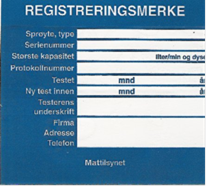Som et synlig bevis på at sprøyta er funksjonstestet og oppfyller kravene, påklebes et blått registreringsmerke på tanken. Merket dateres og underskrives av tester. En testprotokoll blir utfylt og ett eksemplar blir tildelt bruker. En funksjonstestlogo påklebes også sprøytene for å synliggjøre at den er testet.