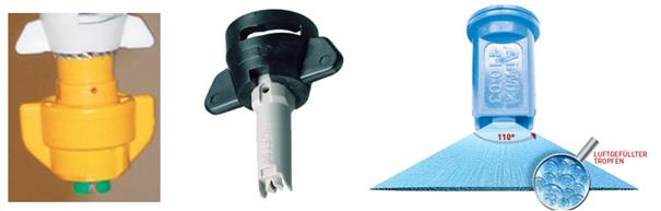 Fra venstre til høyre: TurboDrop injektordyse som var den første injektordysetypen og som fortsatt selges, Hardi og Lechler luftinjektordyse og Airmixdyse fra Agrotop. Foto: Hardi, Lechler og Agritop.