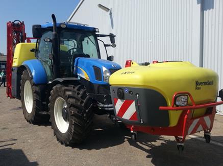 Bruk av fronttank er blitt mer vanlig. Det gir flere fordeler, blant annet større kapasitet (mindre transport), bedre vektfordeling (stadig større bakmonterte sprøytetanker brukes) og også mulighet for bruk av andre plantevernmidler der det skulle trenges. Fronttanken på bildet har egen skylletank og pumpe. Alternativet er trailersprøyte, men den kan være vanskeligere å bruke i mer kupert terreng. Foto: Nils Bjugstad, NMBU.